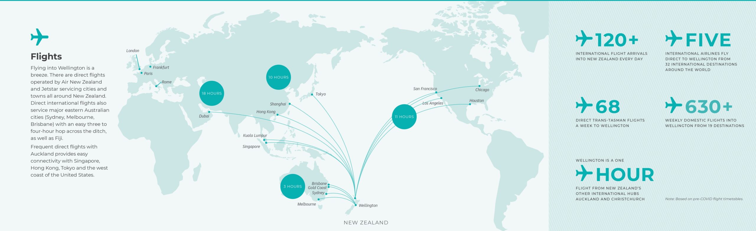 Options to fly directly to Auckland (New Zealand's main international airport) or directly to Wellington with a new Singapore Airlines connection via Canberra. Numerous daily flights connect Auckland and Wellington with a 1 hour flight time.